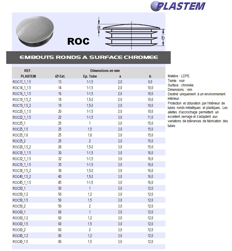 | ROC14_1_1.5 | Embouts ronds pour tube Ext. 14 mm Ep. 1-1,5 - Surface chromée | Prix/pce - Price/pce | 0.3356 | Détails |