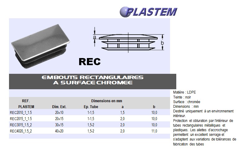 | REC2010_1_1.5 | Embouts rect. pour tube Ext. 20x10 mm Ep.1-1,5 - Surface chromée | Prix/pce - Price/pce | 0.3824 | Détails |