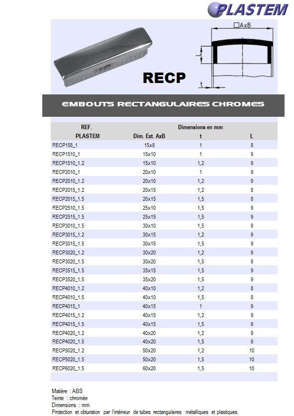 | RECP1510_1.2 | Embouts rectangles pour tube Ext. 15x10 mm Ep.1,2 - ABS chromé | Prix/pce - Price/pce | 0.5707 | Détails |