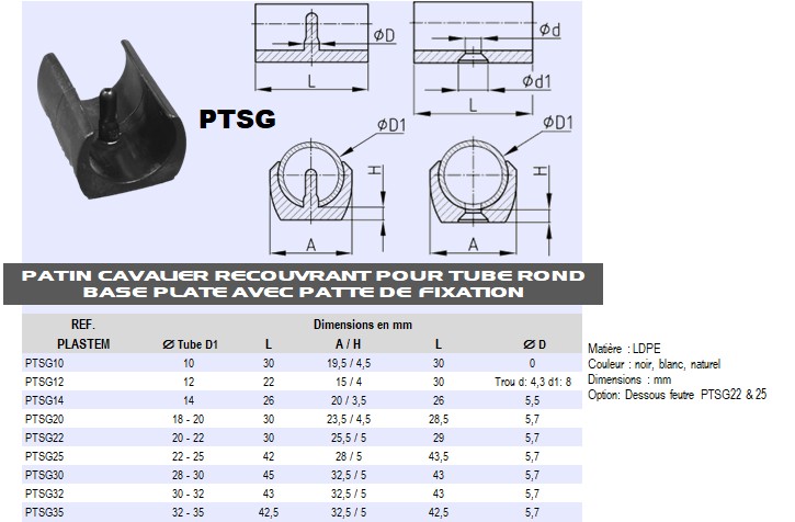 | PTSG22 | Patin pour tube diam ext 20 à 22 L29 mm Teton 5,7 mm - PE Noir | Prix/pce - Price/pce | 0.3291 | Détails |