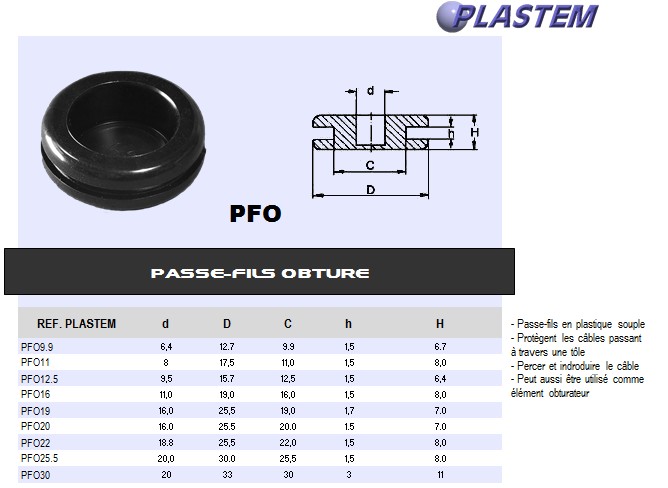 | PFO19 | Passe-fil obturé d:16 - D:25,5 - C:19 - h:1,7 - H:7 mm Noir | Prix/pce - Price/pce | 0.6883 | Détails |