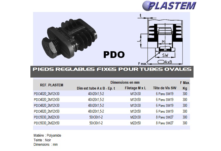 | PDO4020_2M12X50 | Pied réglable tube Ext 40x20 mm Ep 1,5-2 - Filetage M12 Ht 50 mm | Prix/pce - Price/pce | 0.9737 | Détails |