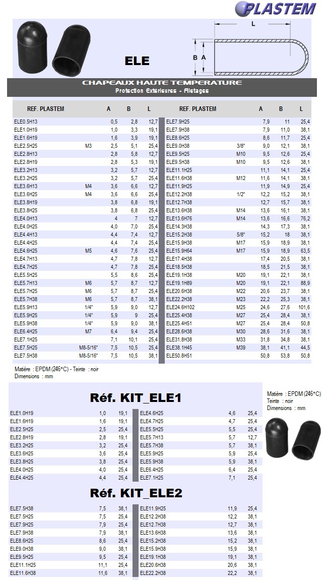 | ELE15.2H38 | Embouts Diam int. 15,2 Ht. 38,1 mm - EPDM noir | Prix/pce - Price/pce | 0.3246 | Détails |