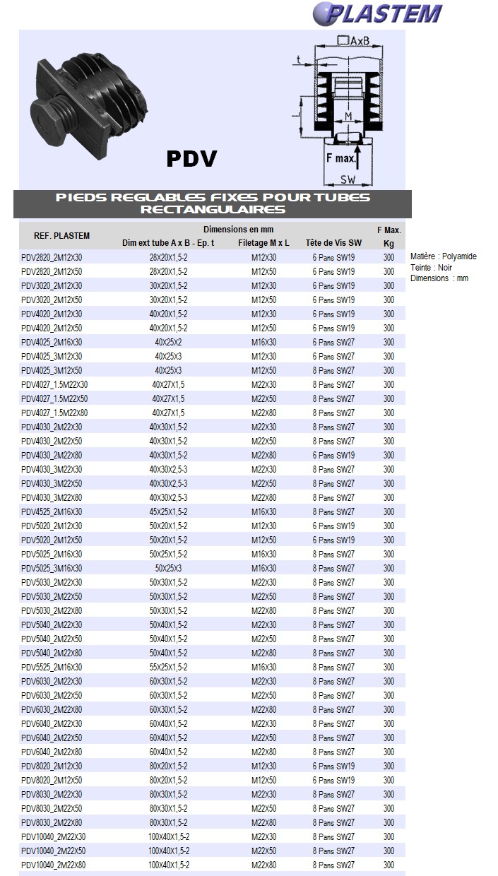 | PDV4020_2M12X50 | Pied réglable tube Ext 40x20 mm Ep 1,5-2 - Filetage M12 Ht 50 mm | Prix/pce - Price/pce | 0.7680 | Détails |