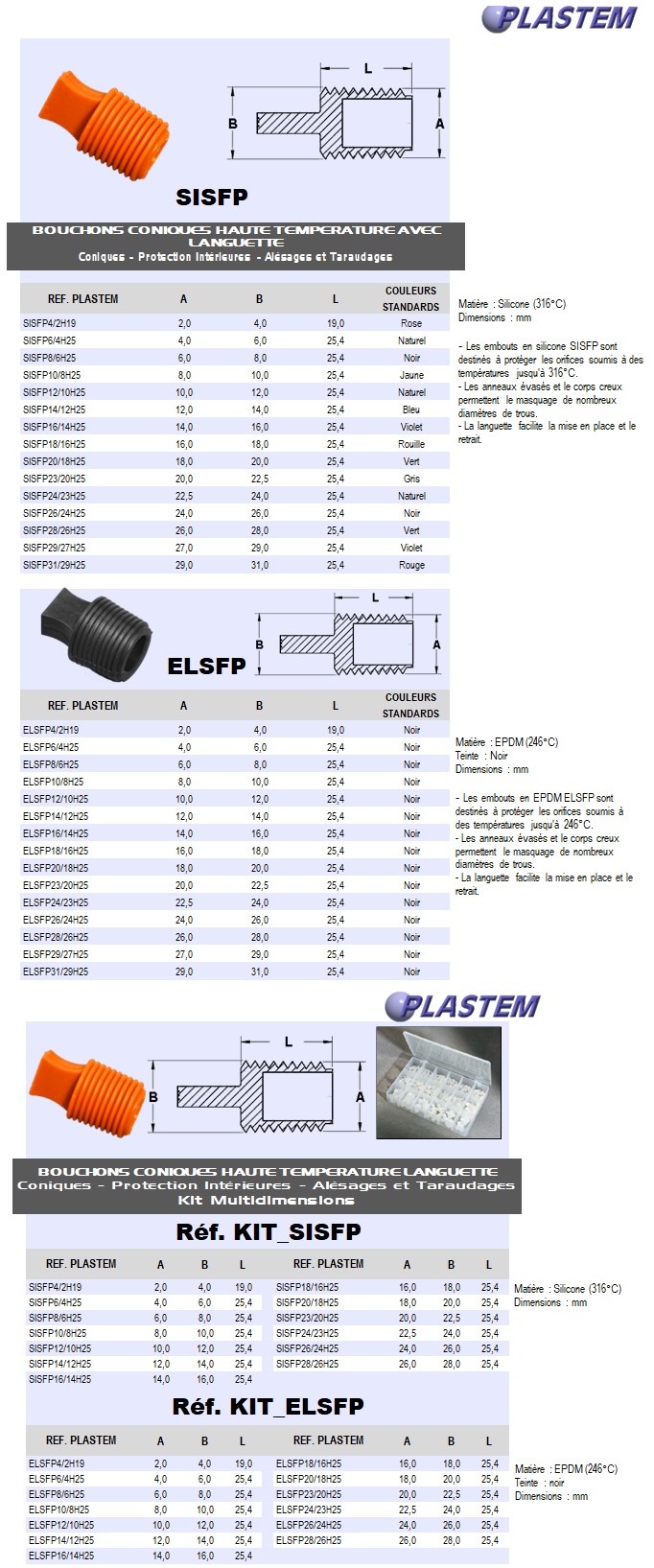 | SISFP4/2H19 | Caps coniques Dim ext 2 à 4 Ht 19 mm + languette - Silicone | Prix/pce - Price/pce | 0.1917 | Détails |