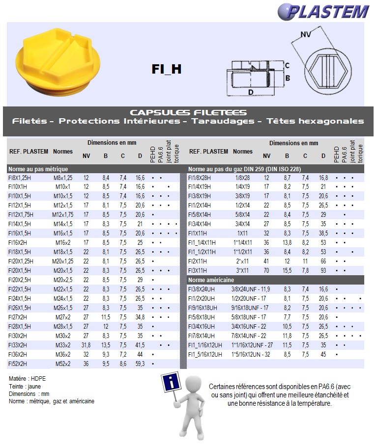 Le FI_H est un bouchon fileté destiné à protéger les orifices intérieurs filetés et utilisé comme bouchon fileté de tuyauterie et taraudages. Certaines références sont disponibles en PA6.6 (avec ou sans joint) pour une meilleure étanchéité et une résistance à la température.