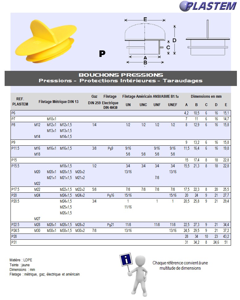 | P6 | Bouchons pression Diam Ext. 10,5 mm Col. 15,1 mm - Jaune | Prix/pce - Price/pce | 0.1717 | Détails |