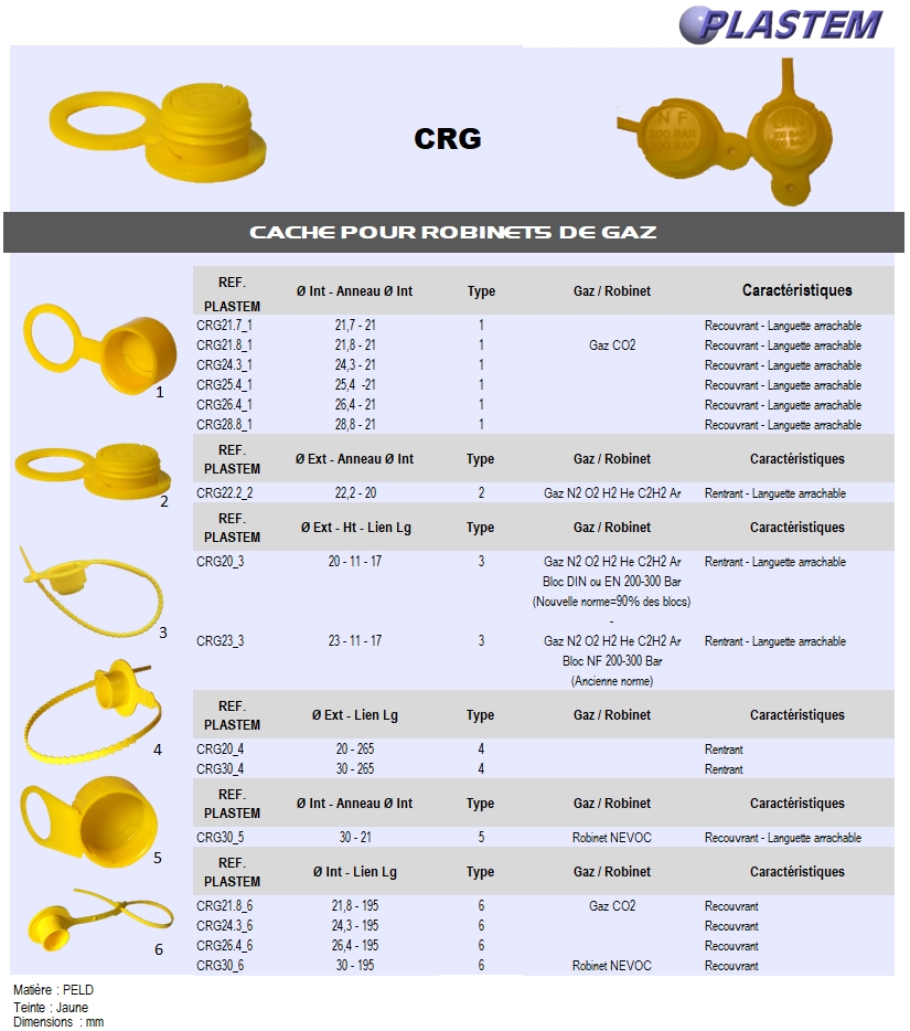 | CRG23_3 | Cache robinet gaz NF200-300Bar Ext.23 Ht.11 Lien 17mm Type 3 - Jaune | Prix/pce - Price/pce | 0.6600 | Détails |