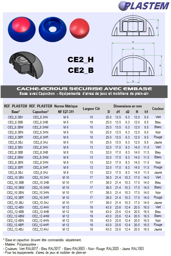 | CE2_12.4BR | Cache écrou à embase M12 Clé 19 mm - Base Rouge | Prix/pce - Price/pce | 0.4416 | Détails |
