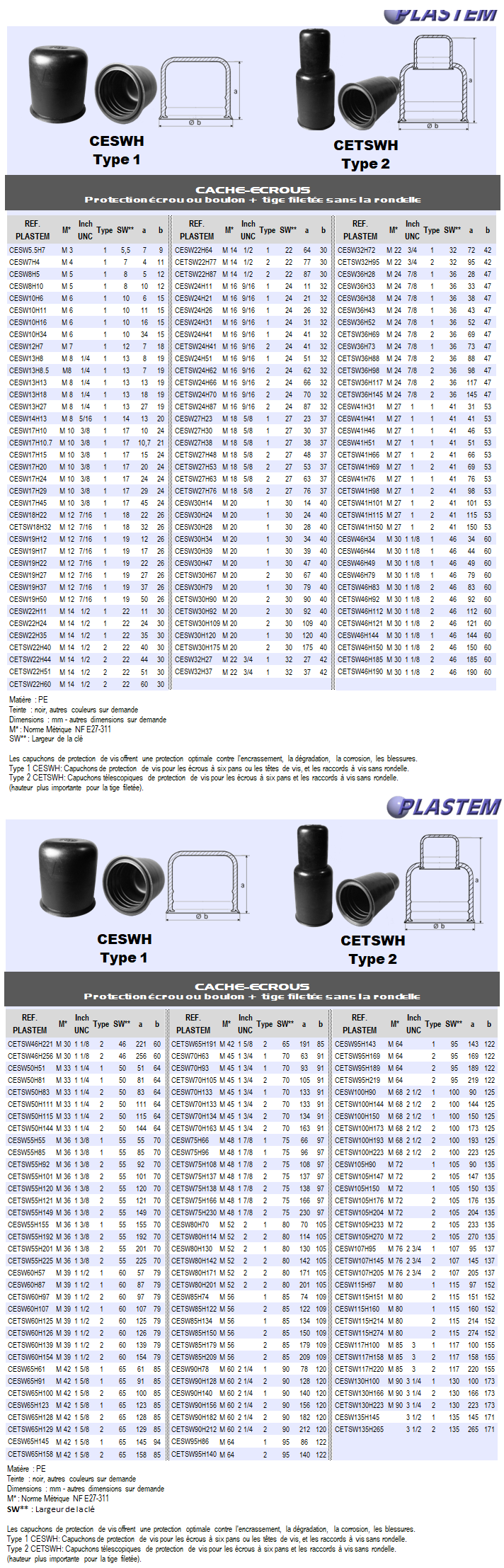 | CESW10H34_ | Cache écrou M 6 Clé 10 mm Ht. 34 mm - PE Noir | Prix/pce - Price/pce | 0.2494 | Détails |