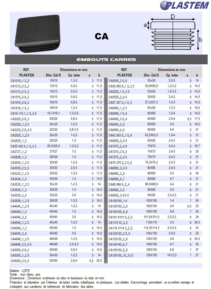 Le bouchon Embout Ailettes carré a été spécialement conçu pour la protection et l'obturation à l'intérieur de tube de forme carrée et de matière plastique et métallique. Ces bouchons Embout Ailettes carré d'une très grande qualité seront d'une grande utilité en assurant un très bon serrage tout en s'adaptant aux changements de tolérances de fabrication des tubes grâce à ses ailettes d'accrochage. Le plastique à laquelle nos bouchon Embout Ailettes carré ont été fabriqués est le PELD. Le PELD qui est un plastique à basse densité qui possède des propriétés très intéressantes en terme de résistance aux chocs ainsi qu'à l'imperméabilité à l'eau. Ces embouts plastiques sont disponibles en 3 couleurs standards: en noir ; en blanc et en gris. Si vous souhaitez une autre couleur, vous pouvez en faire la demande en nous contactant.
