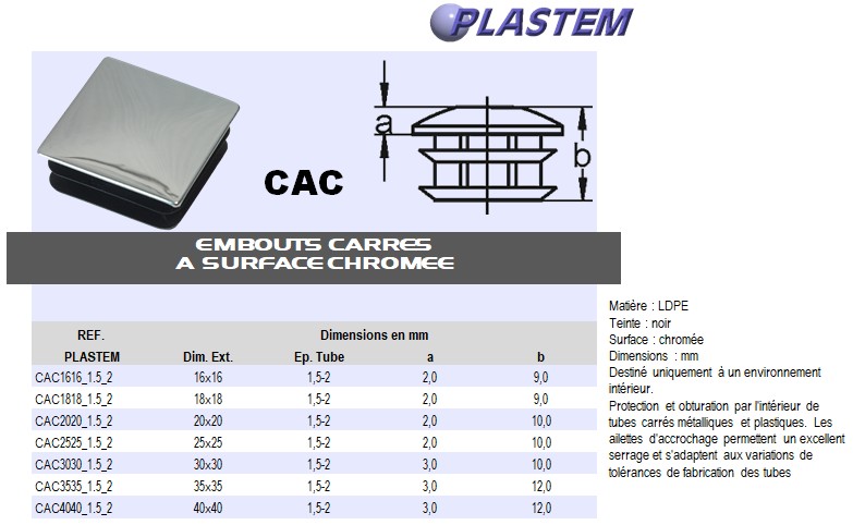 | CAC4040_1.5_2 | Embouts carrés pour tube Ext. 40x40 mm Ep.1,5-2 - Surface chromée | Prix/pce - Price/pce | 0.6436 | Détails |