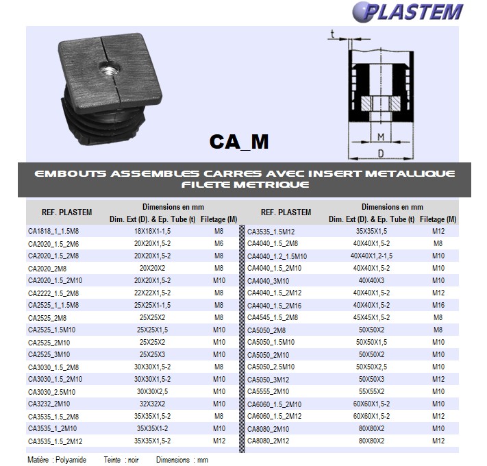 | CA3535_1.5M12 | Embouts carrés noirs tube Ext 35x35 mm Ep 1,5 - Insert métal M12 | Prix/pce - Price/pce | 0.9791 | Détails |