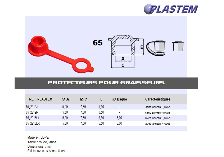 Notre gamme comprend plusieurs références de protections graisseur adaptées aux différents usages. Parmi elles, la référence 65_2912J, de couleur jaune, d’un diamètre de 5,5 mm, ainsi que la référence 65_2912R en rouge avec les mêmes dimensions. Nous proposons également des modèles à languette comme la 65_2913LJ (jaune, 5,5 mm) et la 65_2913LR (rouge, 5,5 mm), qui assurent un maintien optimal tout en restant faciles à poser et à retirer.