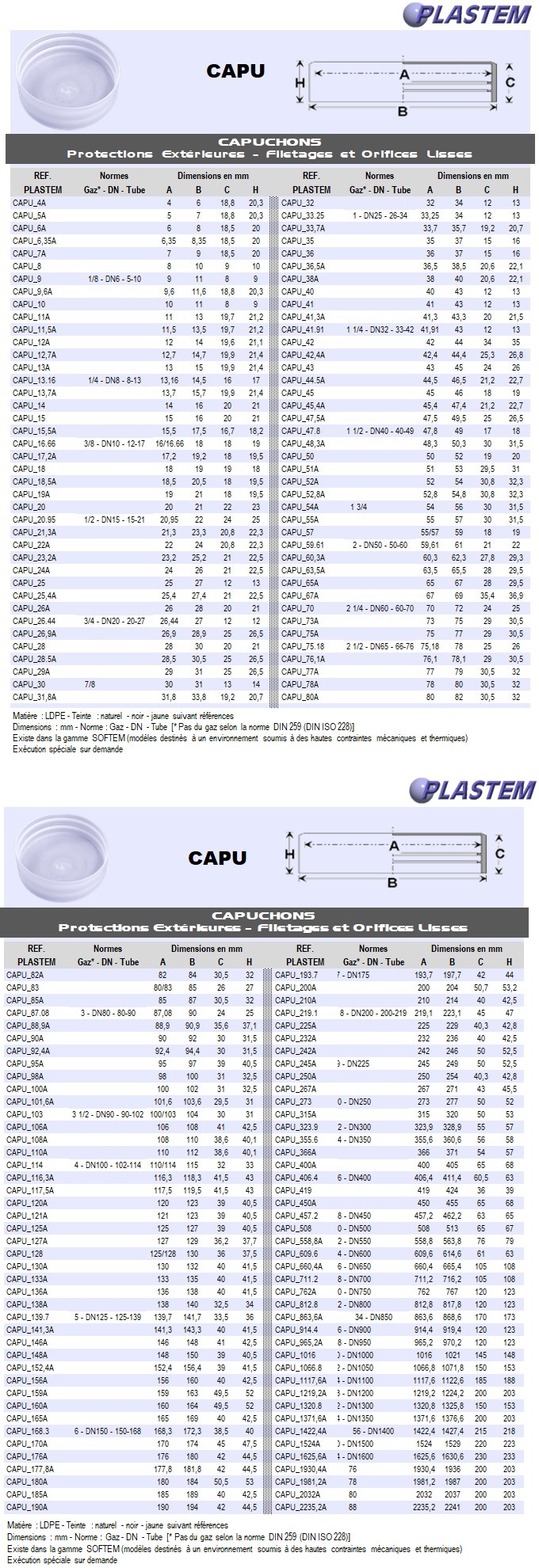 bouchon-plastique.com | Tableau bouchon protection plastique externe pour tube CAPU pour la protection extérieure des filetages et orifices lisses externes