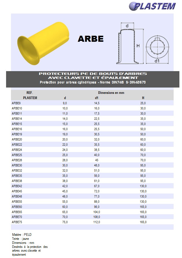 | ARBE30 | Embout d'arbre à clavette Diam int. 30 Col. 48 Ht. 95 mm - PE Jaune | Prix/pce - Price/pce | 0.5223 | Détails |
