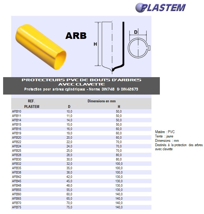 | ARB35 | Embout d'arbre à clavette Diam int. 35 Ht. 100 mm - PVC Jaune | Prix/pce - Price/pce | 0.5197 | Détails |