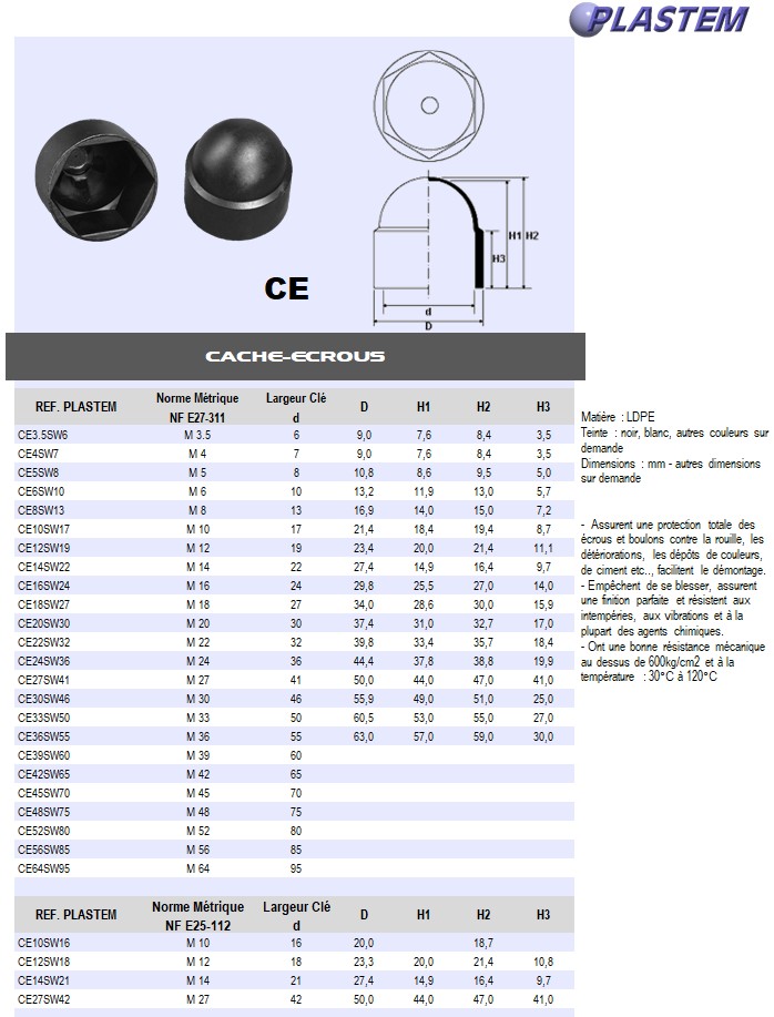 | CE10SW17 | Cache écrou M 10 Clé 17 mm - Noir | Prix/pce - Price/pce | 0.1162 | Détails |