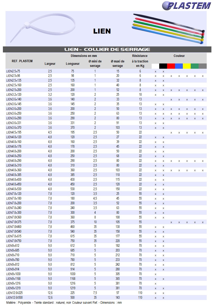 Afin de répondre parfaitement à vos besoins, notre gamme de lien plastique et de collier de serrage en plastique se décline en plusieurs dimensions, détaillées dans chaque fiche produit de cette catégorie et données en millimètres, et plusieurs coloris : nature, noir, bleu, gris, jaune, rouge et vert.