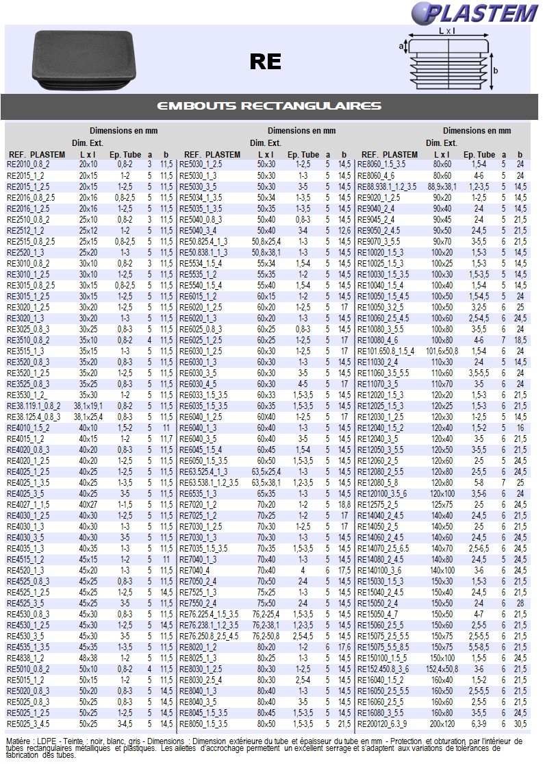 Nous vous proposons dans nos articles en vente des bouchons rectangulaires appelés embout à ailettes rectangle. C’est un objet qui est fait en Peld ; c’est-à-dire que ce bouchon est constitué en matière plastique. Ces articles sont disponibles sous différentes couleurs en gris, noirs et blancs et de différentes tailles chez nous. La dimension extérieure de la partie qui va s’enfoncer à l’intérieur du tube se marie à la proportion normalisée des tubes fabriqués depuis l’industrie lors d’un montage. Ces tailles distinctes correspondent aussi aux différents encombrements des tubes rectangulaires. Quant à l’installation, on n’a pas besoin d’un marteau, du maillet ou d’autres outillages spéciaux pour l’enfoncer, mais il suffit de faire une petite pression avec votre pouce. L’assemblage entre l'embout à ailettes rectangle et chaque tube rectangulaire en plastique (PVC, vinyle, teflon…) ou en d’autres matériaux en métaux est fait sans utilisation de la colle. Côté endurance, la mission de ce bouchon est de boucher les bouts de chaque tube rectangulaire contre les poussières et les autres attaques naturelles. En outre, cet article joue un rôle important pour le design et améliore l’aspect extérieur de chaque tube ou barre.